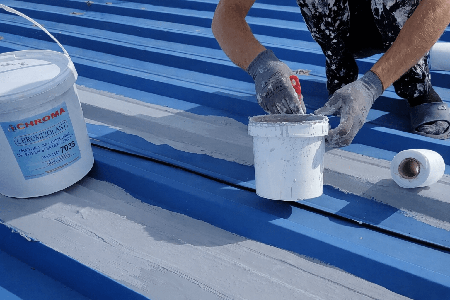 (Cromizolant) diluat cu apa in proportie de 1 la 1. Aceasta are rolul de a forma o pelicula cauciucata care patrunde in toti porii si lipeste particulele de ardezie de pe suprafata ,,cartonului,, astfel incat trafaletul nu se mai incarca cu ardezie si il putem folosi pe toata durata lucrarii. Recomand amorsa doar pe membrana bituminoasa, Pe sapa, beton, gresie sau tabla se poate aplica direct fara amorsa. Dupa uscarea amorsei care poate dura intre 2 si 4 ore in functie de temperatura exterioara, se poate aplica